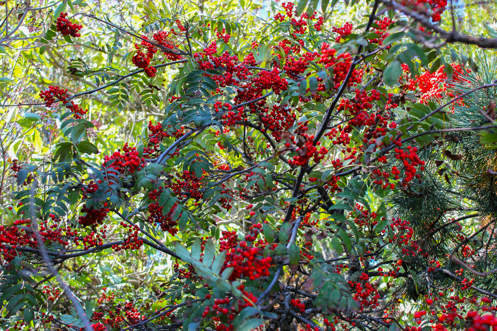 Покидая ущелье орлов, и двигаясь в сторону Кара-Тау, взгляд приковывают ярко красные ягоды рябины. На одном участке раскинулась целая рябиновая роща. На фоне пока еще зеленых листьев контраст потрясающий.