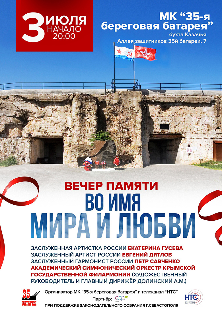 20:00–21:30 – Вечер памяти. Концерт «Во имя мира и любви». Участвуют: заслуженная артистка России Екатерина Гусева (Москва), заслуженный артист России Евгений Дятлов (Санкт-Петербург), заслуженный гармонист России Петр Савченко (Севастополь), Академический симфонический оркестр Крымской государственной филармонии, художественный руководитель и главный дирижёр Александр Долинский (Симферополь). Главная площадь музея. Вход свободный.