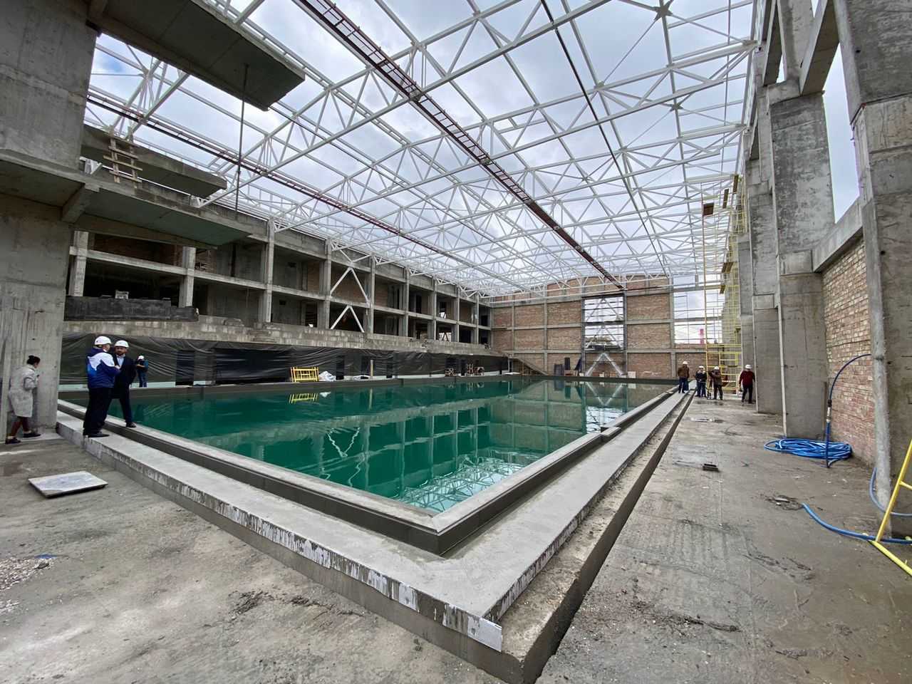 По словам генерального директора компании-подрядчика ООО «Асгард» Игоря Анацкого на сегодняшний день на объекте ведутся гидроиспытания чаши бассейна, работы по устройству разводки инженерных систем, слаботочной кабельной системы, в ближайшее время поступит на строительную площадку кровельный материал и подрядчик приступит к устройству крыши. Также в процессе изготовления оконные металлоконструкции, которые планируют установить, как и выполнить благоустройство прилегающей территории до конца этого года. Сейчас на объекте, по словам Анацкого, находится 25 строителей, а на следующей неделе планируют нарастить численность рабочих до 80 человек.