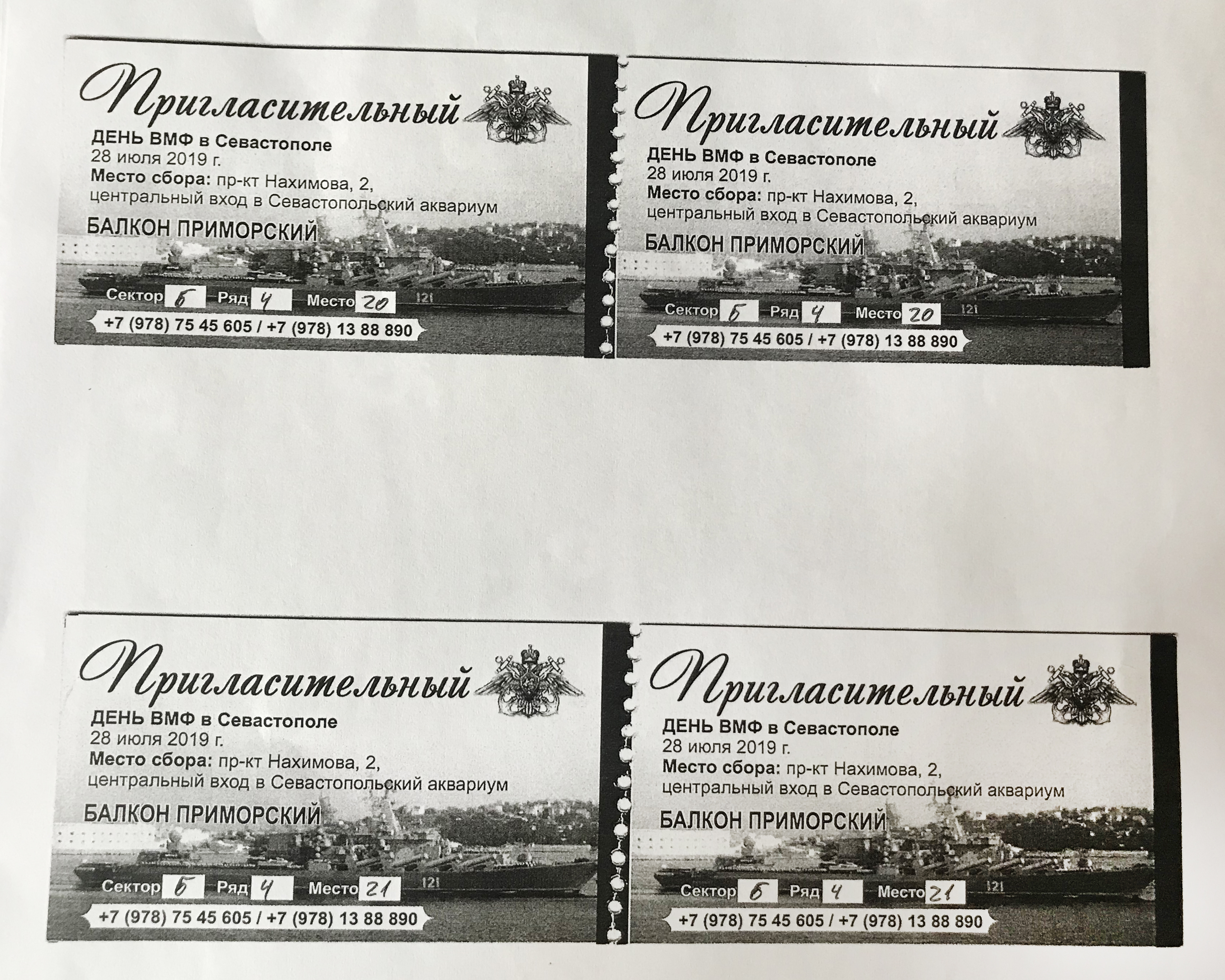 Вернемся к нашей истории. Напоминаем, что пригласительные на просмотр праздничной программы Черноморского флота с трибун никогда не продаются, а распространяются бесплатно.