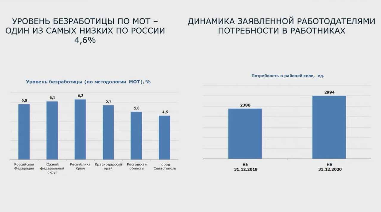 Она уточнила, что в Севастополе, по состоянию на сегодня, уровень безработицы, рассчитанный по методологии МОТ, составляет 3,8% — порядка 8,8 тыс. человек безработных и 0,9 уровень регистрируемой безработицы.