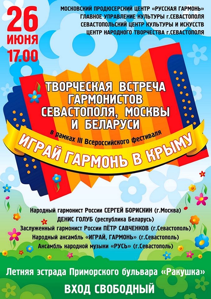 26 июня на Летней эстраде Приморского бульвара «Ракушка» состоится творческая встреча гармонистов Севастополя, Москвы и Белоруссии в рамках III Всероссийского фестиваля «Играй, гармонь в Крыму». Начало в 17:00. Вход свободный.