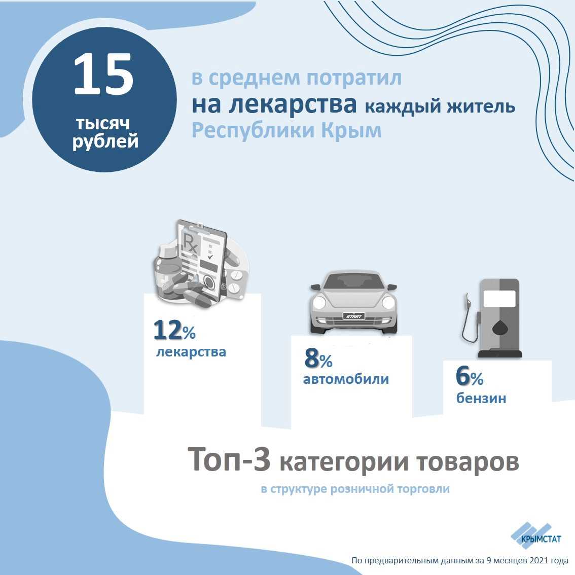 В Крыму на фоне пандемии ожидаемо вырос объем розничной торговли лекарственными средствами. За 9 месяцев 2021 года их удельный вес в структуре оборота является наибольшим и составляет 12%, сообщает Крымстат.