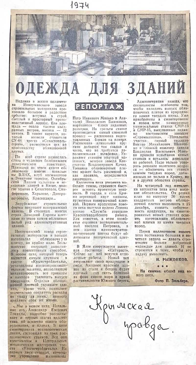 В 60-х годах в истории предприятия произошел еще один важный перелом: ранее облицовочные плиты из инкерманского камня традиционно использовались в регионах с мягким климатом, но со временем их начали использовать в регионах где морозы доходят до 30 градусов, в том числе в Москве, Харькове и других городах.