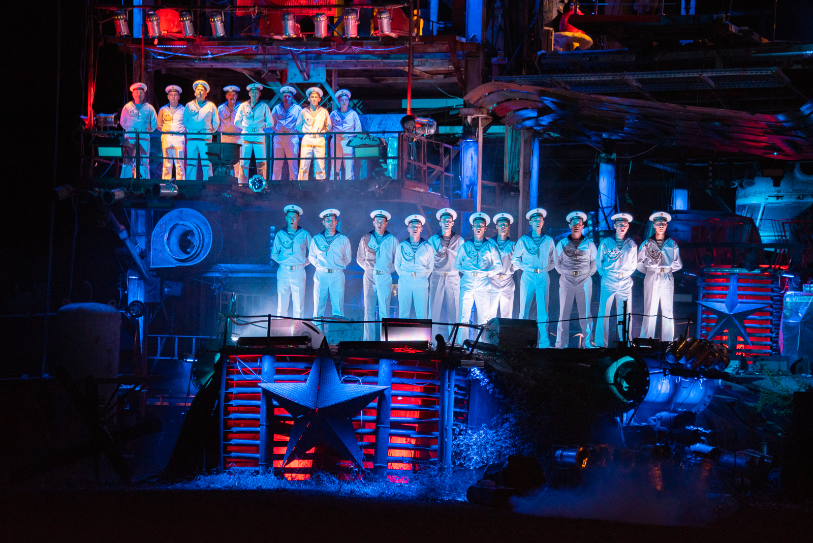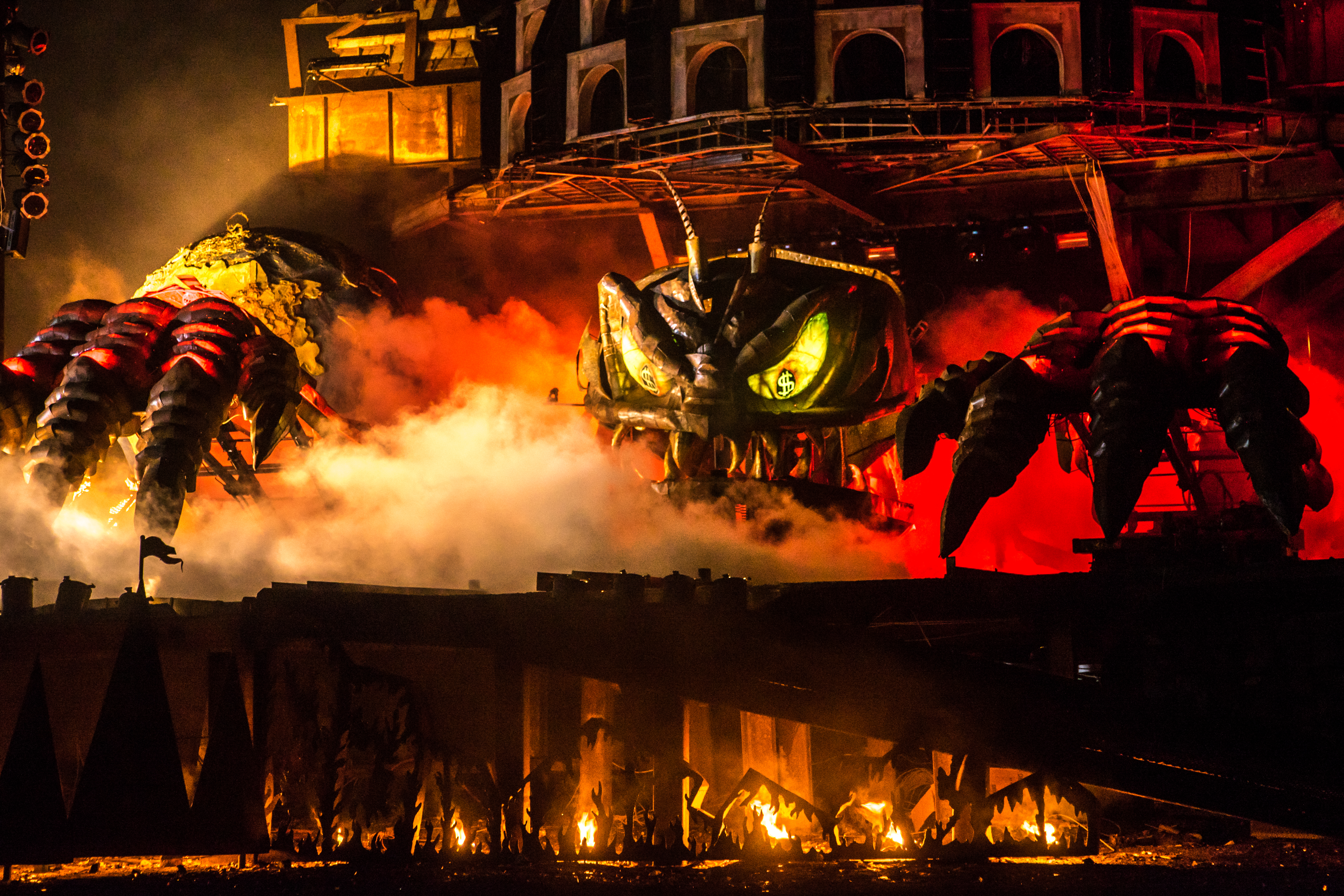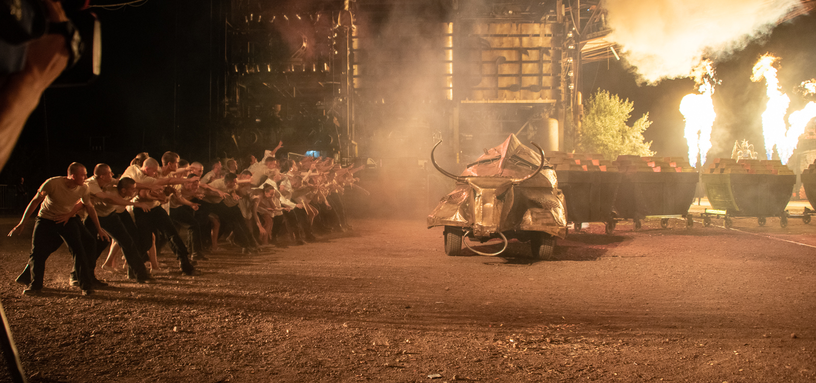 Все декорации сделаны из металла. В основном, это списанное оборудование с московского завода ЗИЛ, тяжелая техника. Мастера «оживили» ее, превратив в диковинных существ. Зрители увидели, как бык с тележками, груженными золотом проехал по сцене, а вслед за ним на троне появился Сатана.