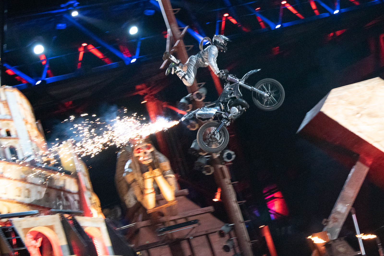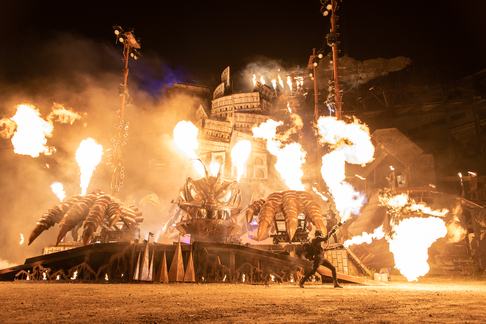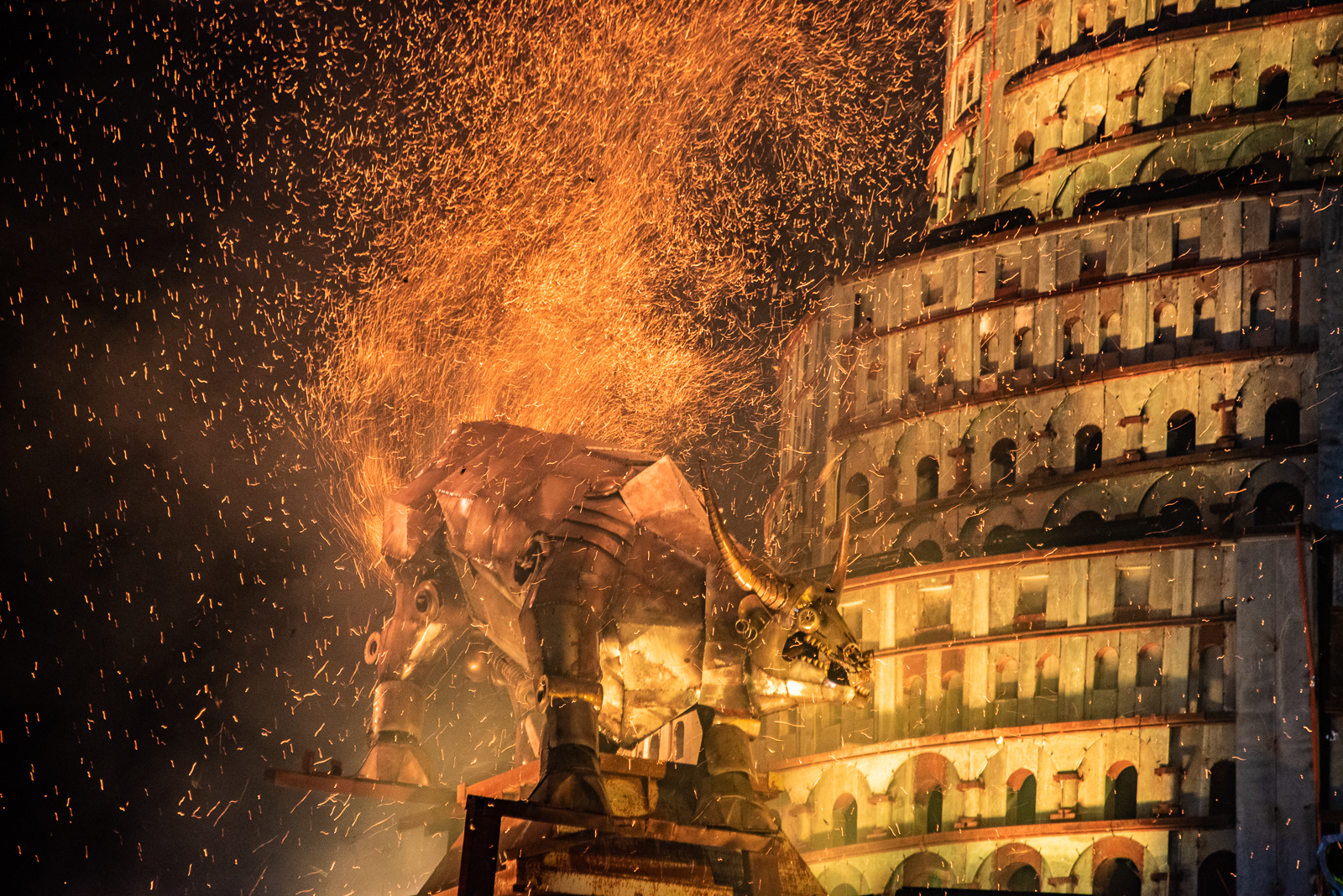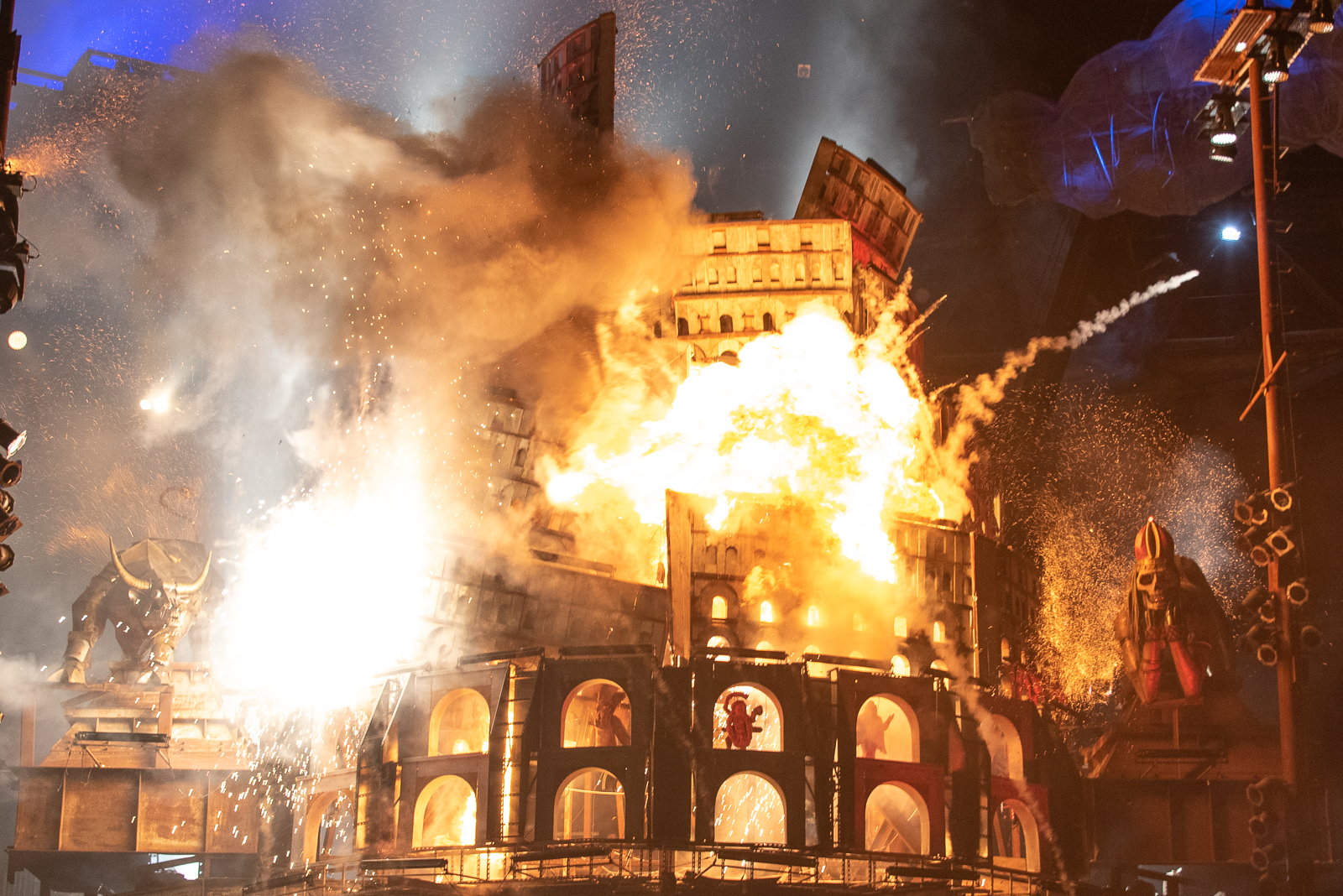 Это байк-шоу назвали «Тень Вавилона», сделав центральным элементом башню. Весит она более 100 тонн. И каково же было удивление публики, когда в небе разыгралась стихия – ураганный ветер, молнии, смерч и Вавилонская башня под взрывы и клубы огня начала рушится, как карточный домик.