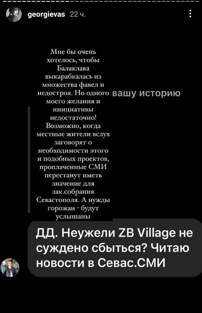 «Мне бы очень хотелось, чтобы Балаклава выкарабкалась из множества фавел и недостроя. Но одного моего желания и инициативы недостаточно! Возможно, когда местные жители вслух заговорят о необходимости этого и подобных проектов, проплаченные СМИ перестанут иметь значение для заксобрания Севастополя. А нужды горожан – будут услышаны. Неужели ZB Village не суждено сбыться? Читаю новости в севастопольских СМИ», — написала в своих социальных сетях Георгиева.
