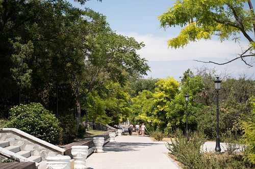 Но прекрасный вид открывается не только с ротонды, но буквально из каждого уголка сквера, так как его боковая аллея тянется вдоль берега, образуя одну сплошную смотровую площадку. Вдоль нее установлены лавочки.