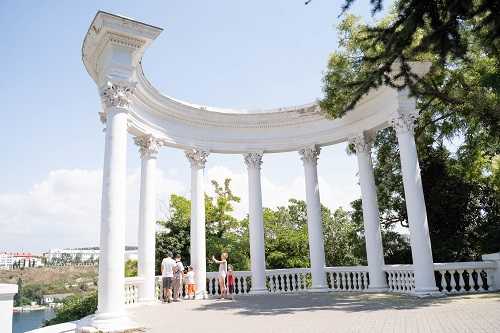 Доминантной сквера остается белоснежная ротонда, венчающая смотровую площадку в самом начале парковой зоны. Отсюда открывается замечательный вид на корабли и комплекс зданий Черноморского филиала МГУ на Корабельной стороне.