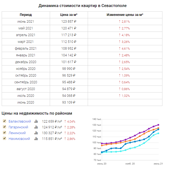 Согласно обновленным данным аналитических агентств стоимость квадратного метра жилья на рынке недвижимости в Севастополе за первую половину 2021 года выросла на 20 % и составляет 123, 9 тыс рублей.