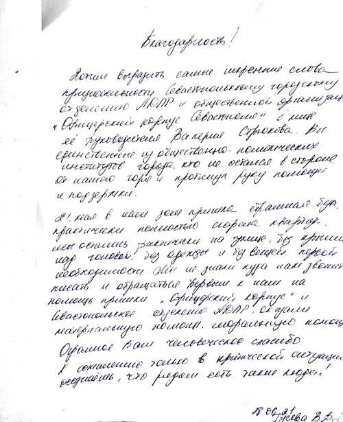 «Оказавшись в такой сложной жизненной ситуации, мы не знали, куда звонить, писать и обращаться. Первыми к нам на помощь пришли «Офицерский корпус» и Севастопольское отделение ЛДПР, оказали нам материальную помощь и моральную поддержку. Огромное вам человеческое спасибо. К сожалению, только в критической ситуации осознаешь, что рядом есть такие люди!» — написала Гусева в благодарственном письме в адрес политиков и общественников.