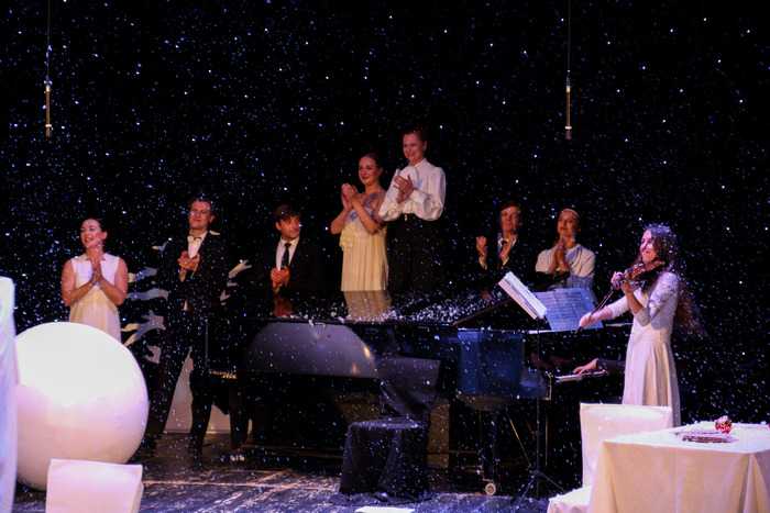 Во время спектакля звучала вечная музыка Рахманинова, Дебюсси, Малера, Калинникова. Романсы до 1918г. под звуки рояля, скрипки и переливы колокольчиков.