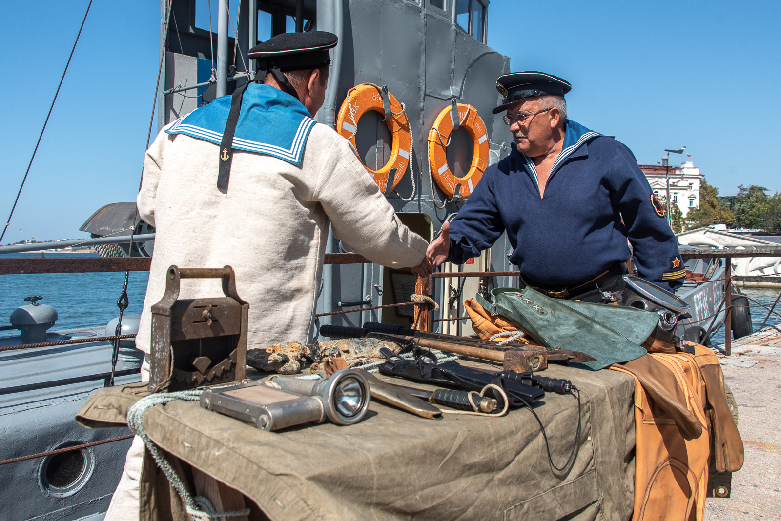 На набережной Корнилова расположилась площадка, где все желающие узнали о водолазных инструментах. Например, о водолазном планшете, предназначенном для зарисовки контура пробоины корпуса судна, а также водолазном светильнике для подводного освещения.