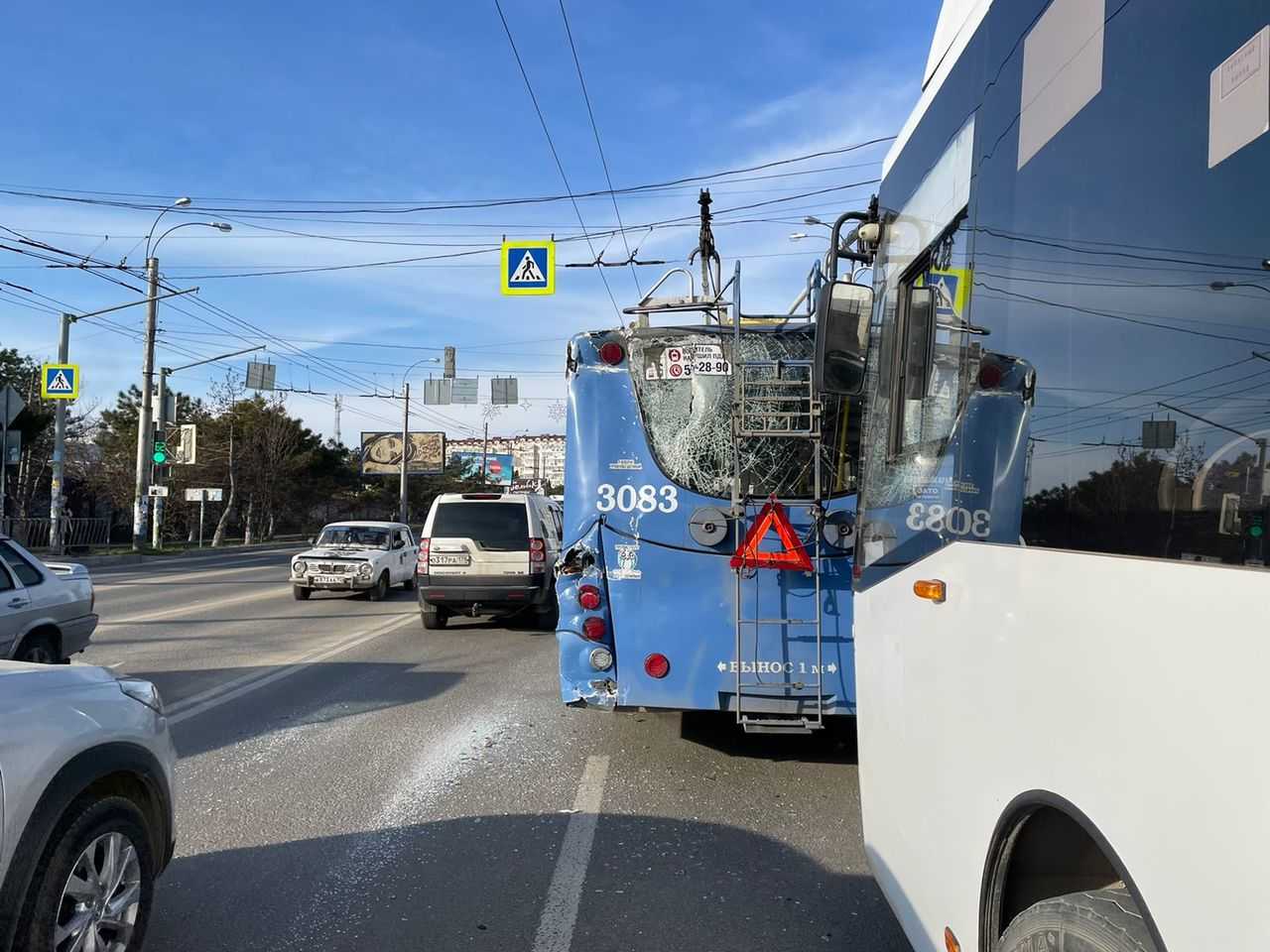 «Водитель городского автобуса 1975 года рождения не выбрал безопасную дистанцию в движении и совершил столкновение с городским троллейбусом», — сообщила заместитель начальника пресс-службы УМВД по Севастополю Мария Нажа.