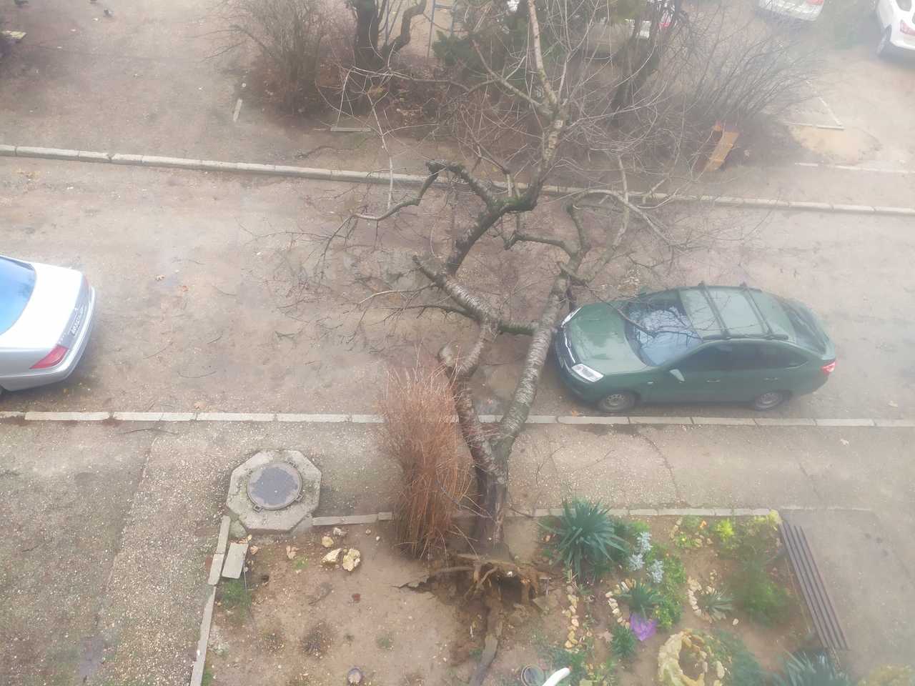 А вот водитель машины, которая оказалась совсем рядом с упавшей черешней, может поверить в свой фарт. Ни одна ветка не коснулась его стального коня, оставив до него безопасное расстоянии сантиметров в 10-15.