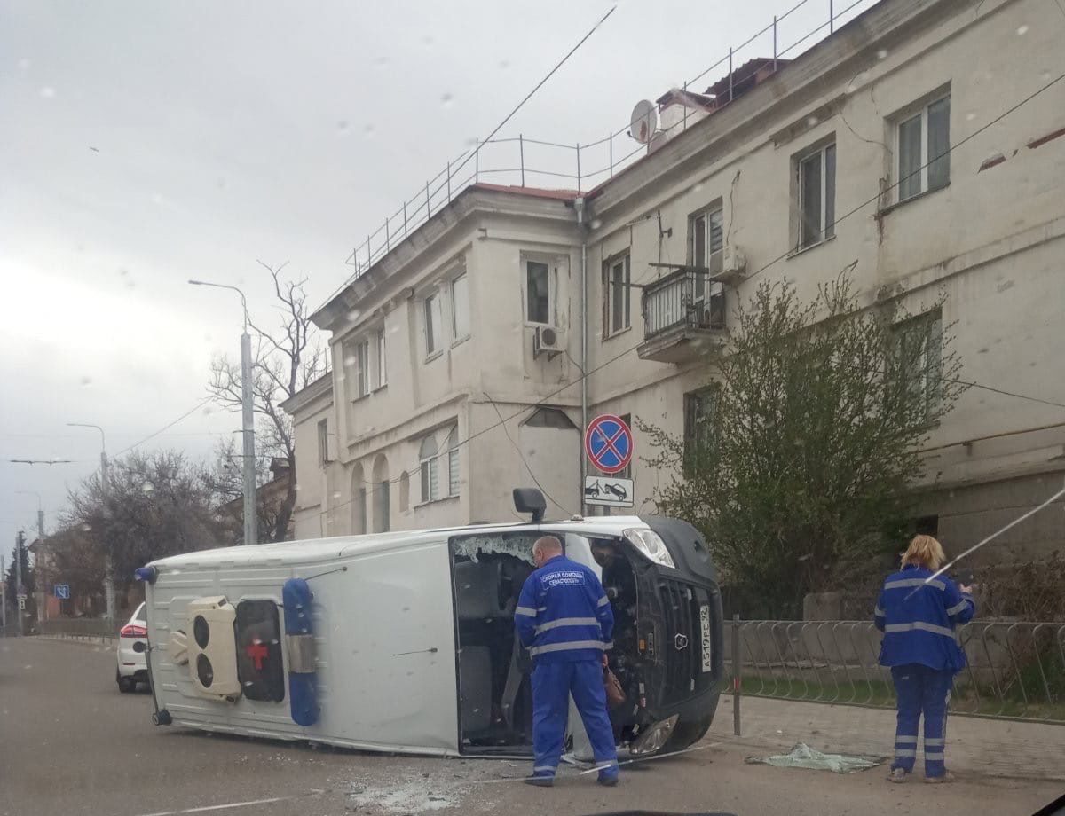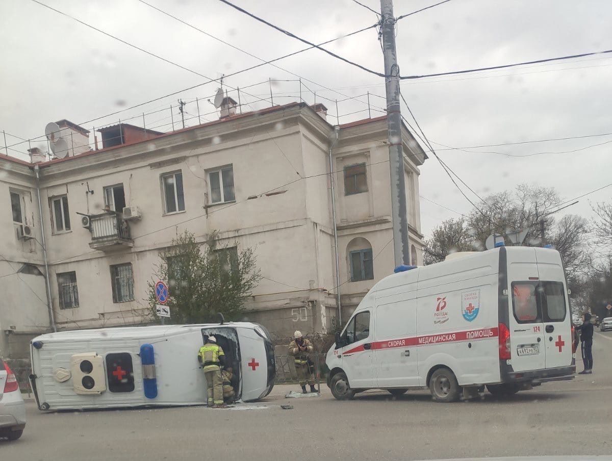 В Севастополе на улице Льва Толстого произошло ДТП с участием автомобиля скорой помощи, в результате которой спецавтомобиль перевернулся на бок.