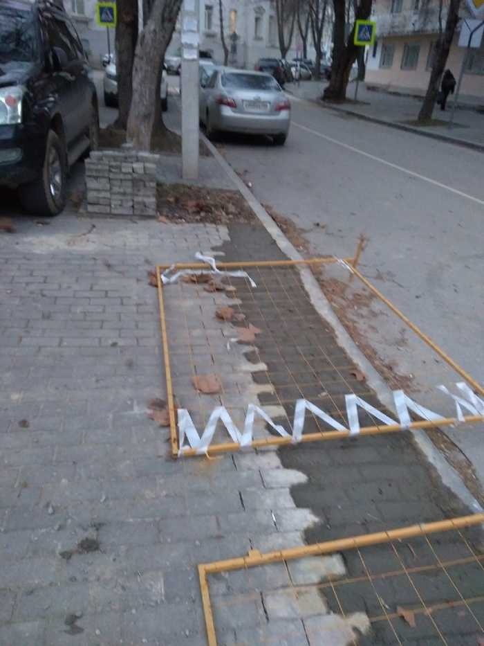 При этом на фото видно, что рядом лежит плитка, которая, скорее всего, и предполагалась для данного участка тротуара.