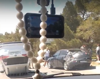 На видео видно, что автомобилю Mazda серьезный удар пришелся в заднюю часть автомобиля. При этом в результате столкновения Toyota перевернулась на крышу.