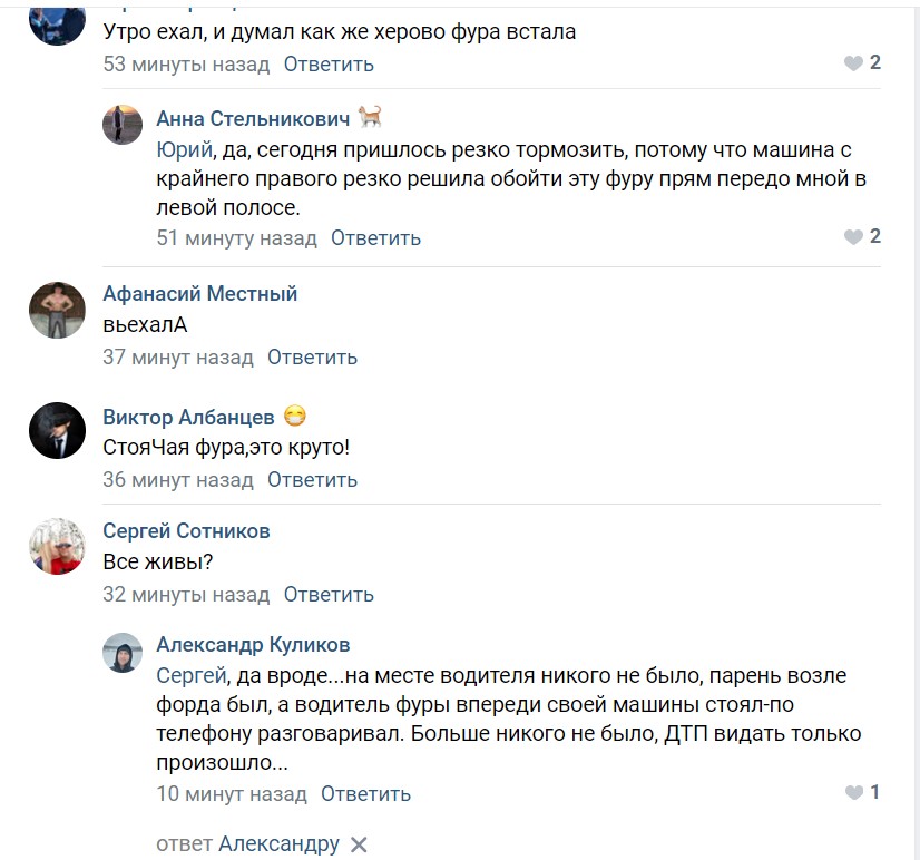 «На месте водителя никого не было, парень возле форда был, а водитель фуры впереди своей машины стоял-по телефону разговаривал. Больше никого не было, ДТП видать только произошло», – написал в комментариях Александр Куликов.